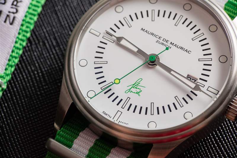 在 Stan Smith 手表項(xiàng)目的最后一分鐘,Maurice de Mauriac 實(shí)際上決定發(fā)布兩款手表的額外配色——每一款都是限量版 100 枚——分別是白色和藍(lán)色以及白色和紅色。所有手表的共同點(diǎn)是“網(wǎng)球”秒針,它在運(yùn)行的秒針上投射出夜光點(diǎn),看起來像一個(gè)小網(wǎng)球,很容易成為手表上最好的細(xì)節(jié)之一。這個(gè)細(xì)節(jié)實(shí)際上是從一個(gè)廉價(jià)的阿迪達(dá)斯品牌手表系列(有幾種形式)中借來的,該系列也是獻(xiàn)給斯坦史密斯的。Maurice de Mauriac Stan Smith 手表的另一個(gè)重要細(xì)節(jié)是表盤上的“Swiss Made”被“Smith Made”諷刺性地替換。