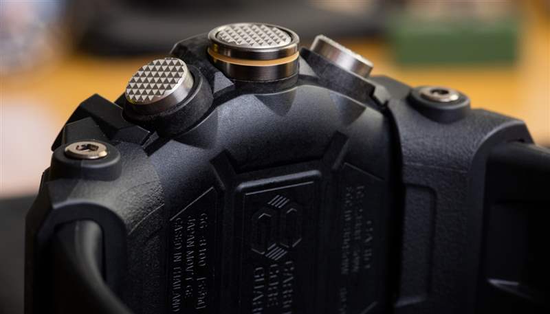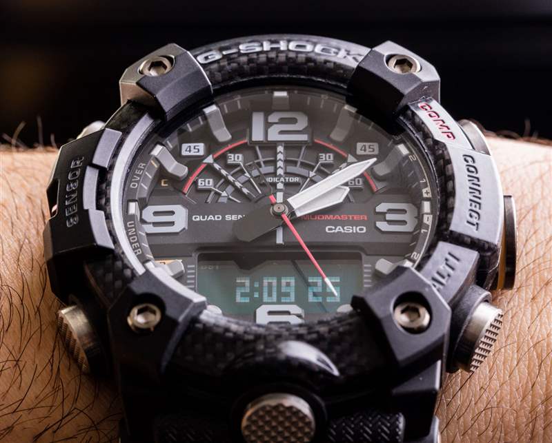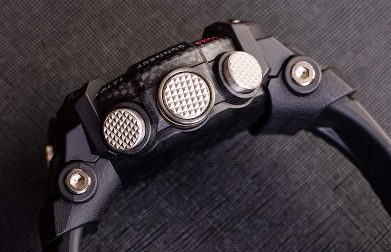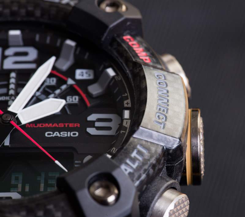 Mudmaster GG-B100 使用玻璃纖維和其他碳材料,重量驚人(55 毫米寬的手表為 92 克),而且結構非常堅固。也太舒服了吧 卡西歐將這一新概念稱為其“Carbon Core Guard”表殼結構。表盤上方是礦物水晶,表殼防水深度達 200 米。從美學上講,大多數情況下黑色碳纖維的外觀(多虧了擋板)非常華麗。卡西歐并沒有直截了當地將其稱為碳纖維,而是將表圈稱為“嵌入玻璃纖維的精細樹脂結構”??ㄎ鳉W對圖案和紋理越來越滿意,這有助于其產品看起來更好。傳統上,我認為大多數人不會將 G-Shock 稱為“漂亮”,即使它們“很酷”。今天,情況正在改變,