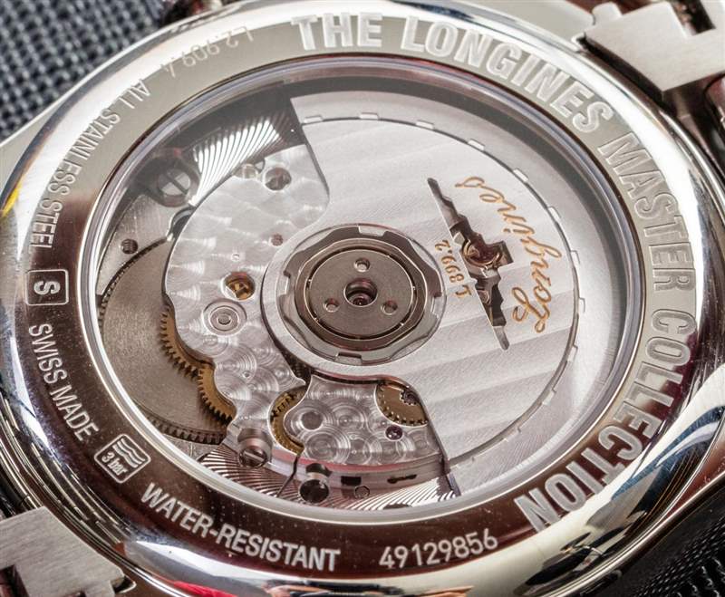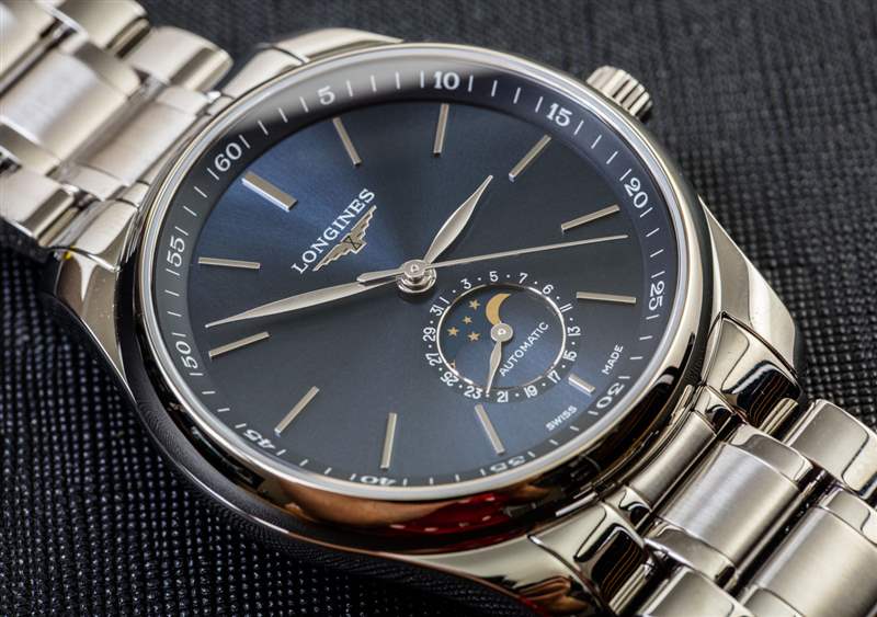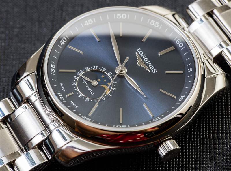 圓頂藍寶石水晶表鏡防水 30 米,全拋光表殼做工非常好,我對整體貼合度和光潔度贊不絕口。浪琴表更喜歡經典,所以表殼和表鏈結構沒有任何驚喜,但正如我所說,它們“傳統上做得很好”。我喜歡的一個不錯的功能是時間、日期和月相復雜功能都是由表冠設置的。這不是第一個這樣做的手表,但在許多月相手表中,月相和/或日期需要通過按下表殼周圍的小嵌入按鈕來調整。這不是問題,因為浪琴表設計的 L899 自動機芯通過表冠執行所有這些功能。