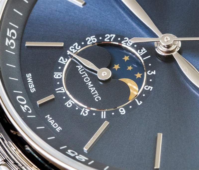 這個藍色表盤很可愛,雖然拋光的銀色指針在某些照明情況下會導致易讀性問題。浪琴表還為 Master Collection Moonphase 提供帶有“silver barleycorn”標記的表盤,藍色指針使表盤更加清晰易讀——但與這款優雅的藍色表款風格不同。鑒于 Master Collection Moonphase 有兩種表殼尺寸和多種表盤變體——對這些手表感興趣的人將受益于在零售環境中試戴幾款,然后再選擇適合他們的款式。