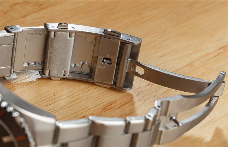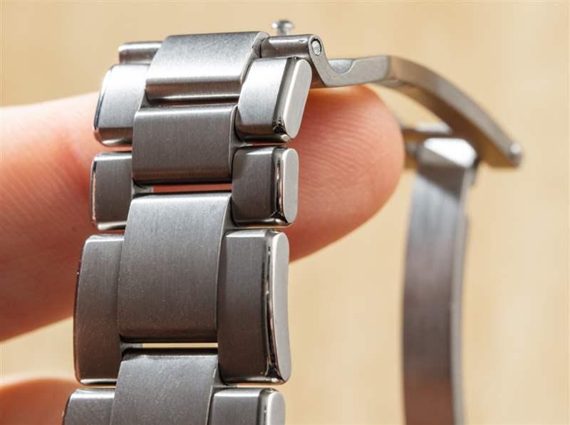 整體手鏈結構非常好,配有舒適、經典的三環手鏈,正如我所說,它得益于一些邊緣拋光。表鏈逐漸變細且不會太厚,因此采用了制作精良的展開式表扣,該表扣還具有微調系統。但是因為展開式開啟按鈕和微調按鈕很相似,所以我發現自己經常在我打算取下手表時不小心調整手鐲尺寸。