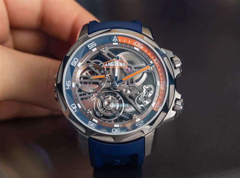 Angelus U51 表殼值得在更多型號中使用,我相信 Angelus 會慢慢玩轉 U51 Tourbillon Diver 的不同變體,除了這款玩具般的藍橙款或藍黃款(稍有不同)之前的擋板)。它是該系列的絕佳選擇,因為明亮而運動的色彩體現了 Angelus 所追求的運動手表主題。工具表愛好者無疑會發現 U51 Tourbillon Diver 存在問題,即使它確實滿足其防水要求。相反,人們應該將 Angelus 歸入與 MB&F 或 Urwerk 相同的類別,作為可穿戴的“鐘表藝術品”。Angelus U51 Tourbillon Diver 可能更接近傳統時計,而不是純粹美學上的異國藝術品,但它仍然有一個引人入勝的故事,這將有助于它贏得它應得的未來崇拜地位。