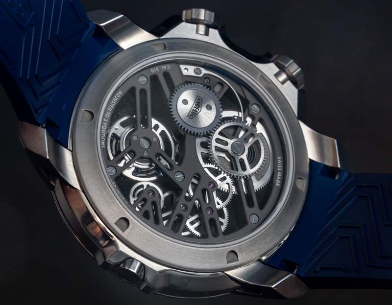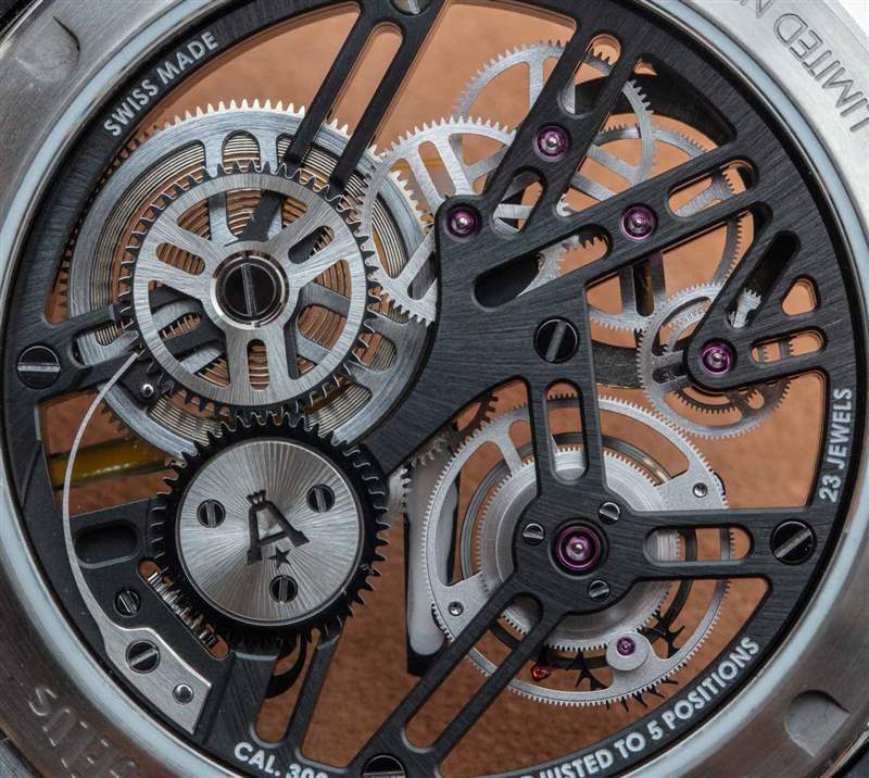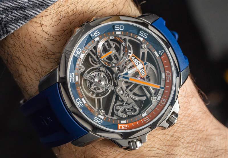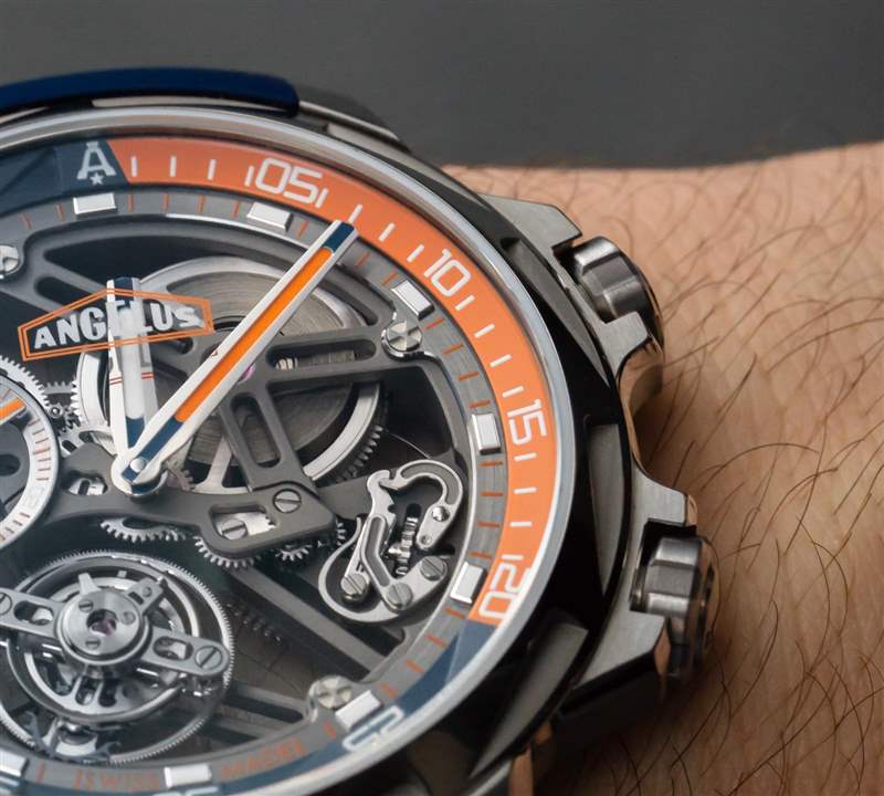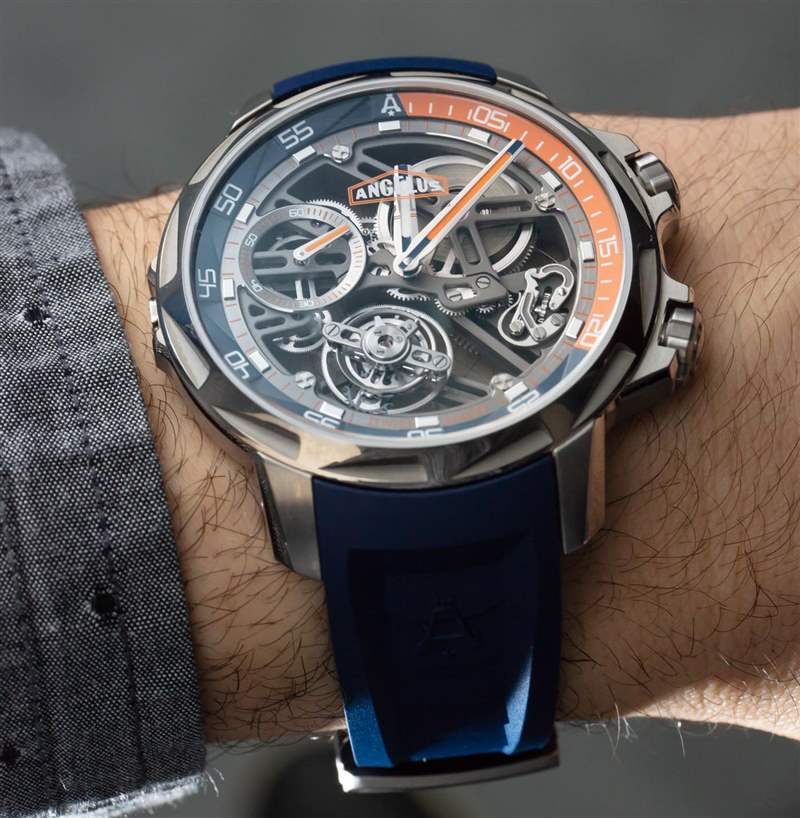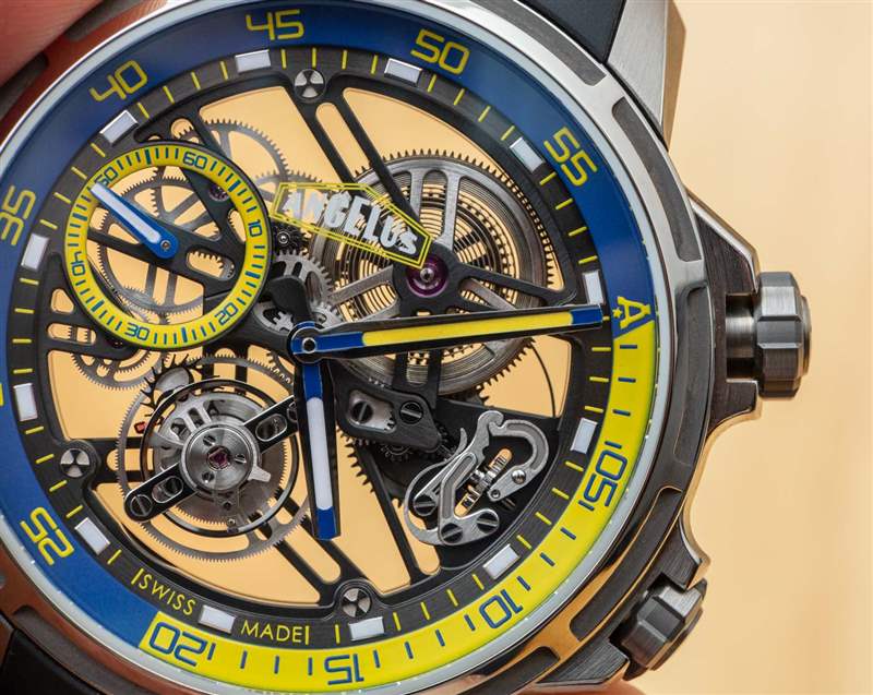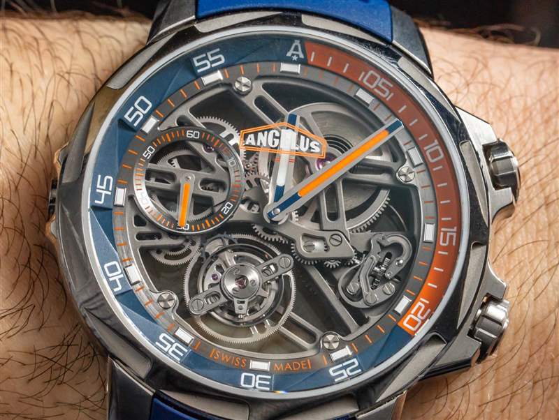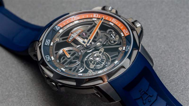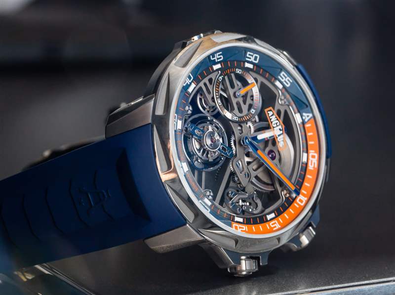 Angelus U51 Tourbillon Diver 也是內部生產的,包括鏤空和手動上鏈的 A-310 機芯,工作頻率為 4Hz,具有 5 天(120 小時)的良好動力儲備。有趣的是,它既有傳統的小秒盤,也有通過陀飛輪窗口顯示的秒針。該機芯在其他方面被設計為實用和纖薄,以及鏤空。重要功能包括用于增加可靠性的調節系統中的硅和用于增加耐用性的滾珠軸承式陀飛輪保持架。作為高級鐘表產品,當然有手工完成,但這不是 A. Lange & Sohne 的機芯。然而,它確實代表了我們在偉大的保守品牌中很少看到的思想開放和鼓舞人心的東西。