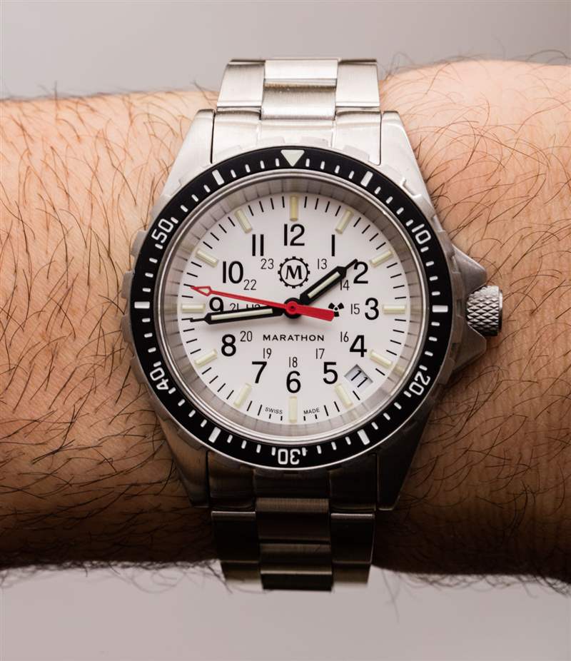為了確保可讀性通常保持較高(與所有 Marathon 手表一樣),對(duì)手表進(jìn)行的另一個(gè)小改動(dòng)是指針的顏色,現(xiàn)在指針的顏色是黑色而不是白色。幾代人以來(lái),如果您想要一款 Marathon 軍用/運(yùn)動(dòng)/潛水表,唯一的顏色就是黑色——這正是軍方想要和認(rèn)可的。如果您的客戶有嚴(yán)格的需求并且只想要黑色表盤,那么這就是您要做的。今天,Marathon 肯定會(huì)繼續(xù)為其軍事客戶制造手表,但其面向消費(fèi)者的關(guān)注點(diǎn)正在成熟和發(fā)展良好。這意味著我們已經(jīng)知道和喜愛(ài)了很長(zhǎng)一段時(shí)間的工具手表系列的更多“時(shí)尚”擴(kuò)展。話雖如此,回想一下,盡管 Marathon 制造軍用手表已有 80 年歷史,
