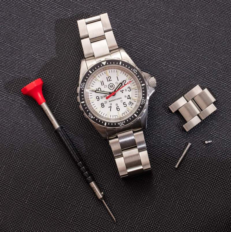 搭配相配的 316L 不銹鋼表鏈(您也可以在黑色橡膠表帶上購(gòu)買)也可以幫助手表呈現(xiàn)最佳外觀。雖然您可以在 Marathon Medium Diver 的 Quartz Ghostbuster 上放置任意數(shù)量的 18 毫米寬的表帶,但我認(rèn)為三連桿拉絲鋼表鏈看起來(lái)最帥氣。手鐲不僅具有迷人的錐形(重要的視覺(jué)觸感),而且還使用厚實(shí)的螺釘來(lái)固定鏈節(jié)。但是請(qǐng)注意,要確定手鐲的尺寸,您需要在螺絲的兩側(cè)使用螺絲刀——這意味著可能需要一些特殊工具。手鐲有一個(gè)折疊式展開式表扣,有點(diǎn)“上一代”,但可以完成工作。如果您需要將手表戴在大夾克或潛水服上,它還具有折疊式潛水員的延伸部分。