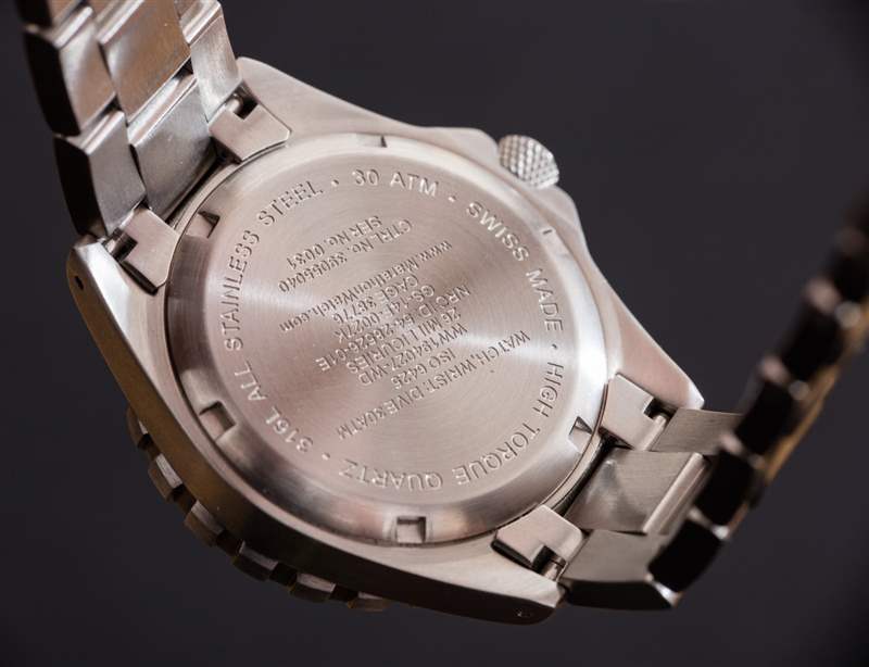 讓我們繼續(xù)談?wù)勈直肀旧怼_@是 Marathon 的入門級(jí)模型,這意味著它的價(jià)格相對(duì)實(shí)惠。Marathon 生產(chǎn)其最受歡迎的型號(hào)(包括 Medium Diver),配備瑞士石英和瑞士機(jī)械機(jī)芯選項(xiàng)。中型潛水員的石英和自動(dòng)機(jī)械型號(hào)之間的成本差異不到 300 美元,這證明了公司的公平定價(jià)做法。36 毫米寬的 MSAR 配備兩種機(jī)芯選項(xiàng),在這里我們看到它配備了瑞士 ETA 口徑 F06“高扭矩”機(jī)芯。為什么要高扭矩?因?yàn)槭中枰銐驈?qiáng)壯才能在那些被自發(fā)光氚氣管壓下的沉重的手周圍移動(dòng)。氚氣管是一項(xiàng)令人難以置信的功能,可確保 Marathon 手表表盤在所有照明條件下(尤其是完全黑暗)都清晰易讀。大部分是綠色的管子用在手上,以及每個(gè)小時(shí)標(biāo)記上。(12點(diǎn)鐘的管子是橙色的,以便在黑暗中更好地視覺(jué)定位表盤。)