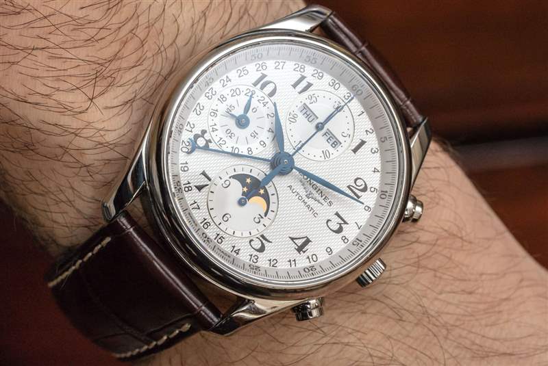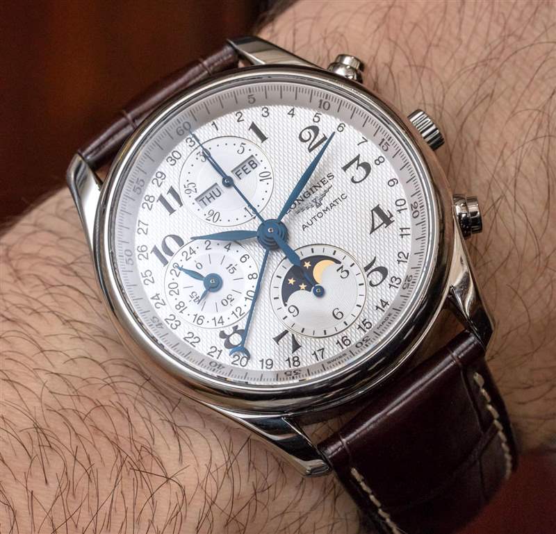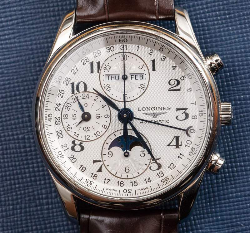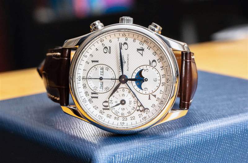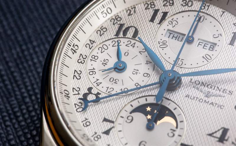 核心 7751 機芯旨在為標志性的 Valjoux 7750 自動 12 小時計時碼表增加功能。它添加的是一個完整的日歷(顯示月份、日期和星期幾),以及一個月相指示器和同步 24 小時指針,有效地用作 AM/PM 指示器。十多年來,我一直在撰寫有關使用 7751 機芯的手表的文章,我將提醒讀者,7751 的缺點之一是它為尋求創造視覺平衡表盤的制表師帶來了特殊的設計挑戰。表盤上信息的大部分“重量”都在左側。這意味著表盤的右側相對稀疏,通常保留用于手表品牌標志。浪琴表設計這款 Master Collection 表盤的設計與 7751 奇特的表盤布局大致相同。