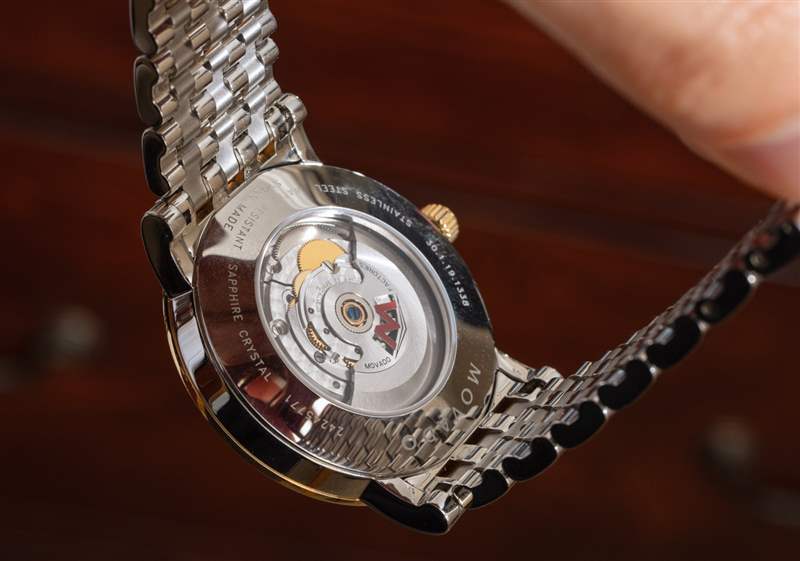 摩凡陀采用更高級的精工級機芯,裝飾精美,并配有定制的摩凡陀“red M”自動擺陀。機芯以 4Hz 頻率運行,動力儲存約兩天。使用自動機芯真的是為了吸引像我這樣的手表愛好者。鑒于表盤只有時針和分針,您甚至看不到運行秒針。因此,佩戴者非常重視自動機芯的價值——但對于鐘表愛好者級產品而言,這絕不是罕見的。