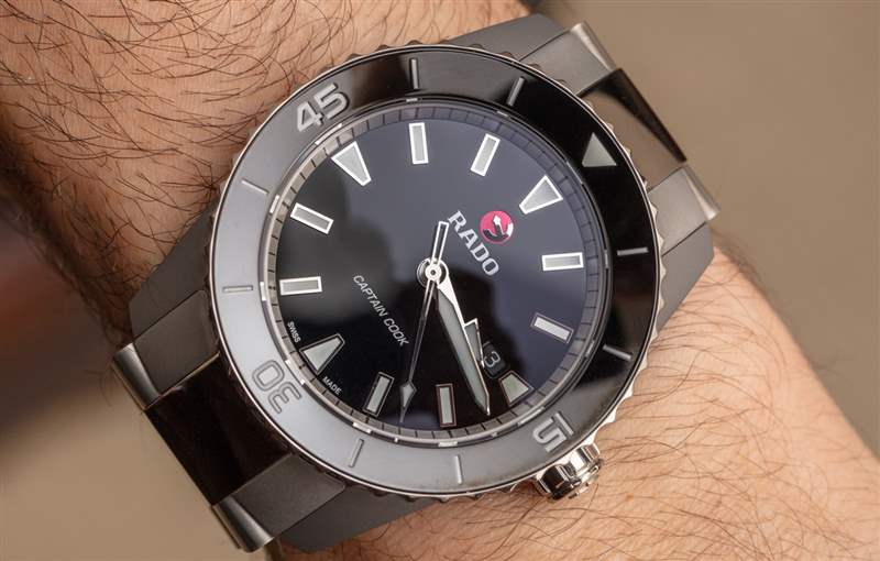 那個小眾受眾是誰?主要是手腕和手大到超大的手表愛好者。對于許多佩戴 Rado 庫克船長 45 毫米寬版本的佩戴者來說,主要問題將是時計的尺寸。表殼寬 45 毫米,厚近 14 毫米,表耳到表耳的距離接近 57 毫米。將其與主要表盤元素的卡通風格豐滿度相結合,您就擁有了一款大型鐘表,除此之外,在視覺上看起來就像一個大型鐘表。我很喜歡雷達提供的庫克船長鈦金屬,但我希望看到它有 42-43 毫米寬的尺寸。雷達表準備好為庫克船長自動腕表系列增添第四種風味了嗎?