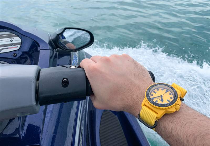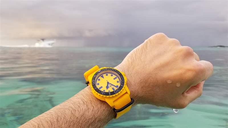 佩戴 Aqua BLK + YLW 是一種有趣的體驗(yàn),因?yàn)槟_始注意到周圍的黑色和黃色的一切。黑色和黃色代表巴哈馬國旗顏色的三分之二(在拿騷周圍的藍(lán)綠色海水中,它成為國旗)。無數(shù)黑色和黃色的魚在水中游動,你會發(fā)現(xiàn)很多潛水設(shè)備也是黑色和黃色的。島嶼周圍也有數(shù)量驚人的服裝和比基尼組合,具有相同的配色理念。我敢打賭,在世界不同地區(qū),這款和未來的 BLK + YLW 手表將呈現(xiàn)出各種身份。