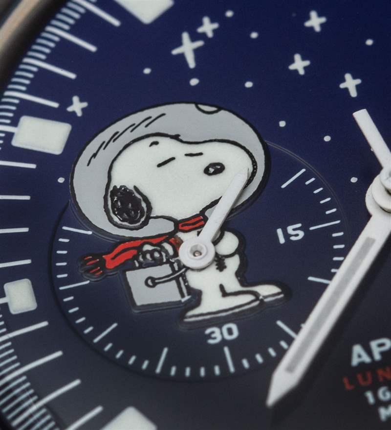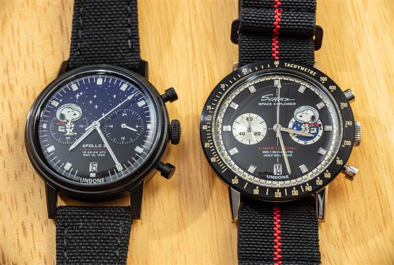 對于 Snoopy Moon Heritage 和 Snoopy Starlight 手表,我們看到 Undone 顯然受到了 Omega Speedmaster 的啟發,當然還有少數 Omega Speedmaster Snoopy 手表。Undone 似乎沒有讓表盤比歐米茄更新鮮有趣嗎?平易近人的價格,以及對致敬和樂趣的關注,可能幫助 Undone 設計團隊對這些“宇航員史努比”手表的更有趣(但仍然實用)的設計充滿信心。這些限量版史努比太空手表的更高價位所帶來的是全新升級的表盤,在史努比 Moon Heritage 手表上具有迷人的夜光和應用時標。后一種型號是最具超霸風格的型號,具有獨特的測速儀表圈。再說一次,我喜歡 Undone 并沒有試圖向任何特定的 Speedmaster 手表致敬,而是似乎受到了整個 Speedmaster 家族的啟發。(注意與其他版本相比,計時小表盤的方向不同。)這些限量版手表還配備了一個額外的彈性表帶,這種表帶如今受到一些收藏家的歡迎。