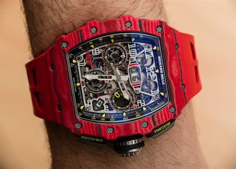 Richard Mille RMAC3 自動飛返計時機芯以 4Hz 運行,兩個發條盒之間的動力儲存約為 50 小時。自動轉子還采用了 Richard Mille 的可變幾何技術,雖然很少使用,但很有趣。它允許制表師(而不是佩戴者)根據佩戴者手腕的活躍程度來改變轉子的旋轉幾何形狀,以使其或多或少容易旋轉。從理論上講,使用此功能可以幫助某人讓手表足夠上鏈,但又不會太上鏈。我還沒有遇到任何人仔細研究過自己的佩戴方式,并讓 Richard Mille 為他們的“手腕習慣”單獨設置轉子幾何形狀。