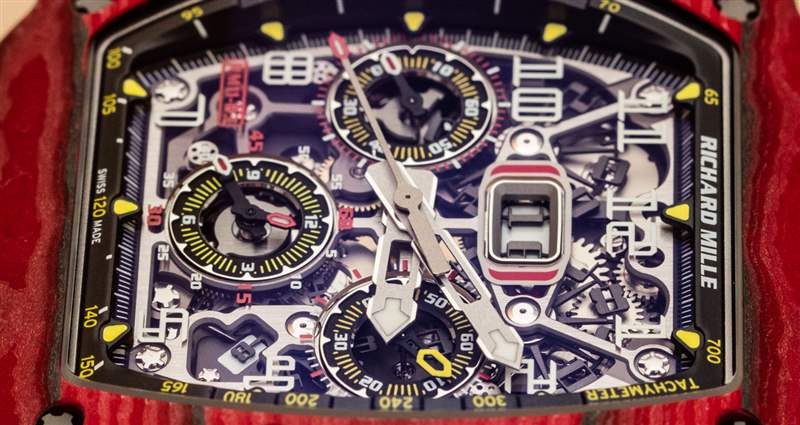RMAC3 機芯包括飛返式計時碼表(重新啟動前無需重置計時碼表)、12 小時計時盤(小時和分鐘計在同一個表盤中)、同步 60 分鐘倒計時表盤和大日期指示器和月份指示器整齊地放置在表盤的 4 點和 5 點之間。這使得 RM 11-03 成為計時碼表年歷——它確實存在,但它是一種非常罕見的機制。從視覺上看,RM 11-03 表盤清晰易讀,但采用鈦合金橋板和大量視覺深度設計以引人注目的方式鏤空,以放大表盤在眼睛中的外觀。大膽的指針和明亮的表盤顏色有助于保持易讀性。廣告訊息廣告信息結束