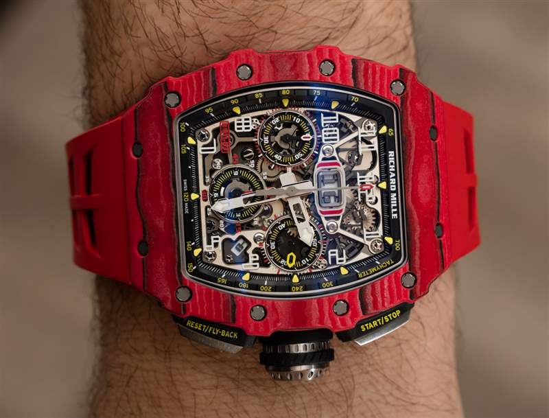 Richard Mille 最新的 RM 11-03 表殼具有獨特的結構,其中機芯固定在作為表殼一部分的支架上,而不是單獨的機芯固定環。這個和其他細節是可能的,因為理查德米勒為其零件制造了很長的加工時間(這些手表成本如此之高的原因之一)。弧形酒桶形表殼寬 44.50 毫米(不包括表冠),高 44.94 毫米,厚 16.15 毫米。佩戴在手腕上的定制和非常高端的橡膠表帶,除了視覺上的自信外,佩戴體驗非常舒適。
