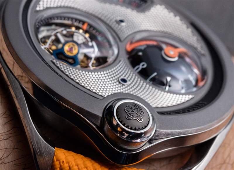 從視覺上看,DC 6 Solstice Half Hunter 看起來(lái)就像一張盯著你看的科幻臉。或者防毒面具,或者蒼蠅,或者蚊子,取決于你的觀點(diǎn)。兩個(gè)相對(duì)的表盤看起來(lái)像眼睛,上面覆蓋著高度圓頂?shù)乃{(lán)寶石水晶。臉的“嘴”實(shí)際上是表冠,這是 DC 系列手表的獨(dú)特元素之一,被 Candaux 稱為“神奇的王冠”。DC 1 和 DC 6 系列手表沒有像我們?cè)诖蠖鄶?shù)其他手表中發(fā)現(xiàn)的那樣在表殼側(cè)面有一個(gè)固定的表冠,而是有一個(gè)表冠,當(dāng)你按下它時(shí)它就會(huì)松開。將表冠從其“內(nèi)部位置”松開后,即可正常拉出以設(shè)置時(shí)間。我所熟悉的唯一一款具有類似表冠概念的時(shí)計(jì)是香奈兒 J12 逆行神秘陀飛輪.?DC 6 表冠系統(tǒng)本身由 31 個(gè)零件組成,并使用由三個(gè)墊圈組成的復(fù)雜系列來(lái)保持腕表的防水性能。