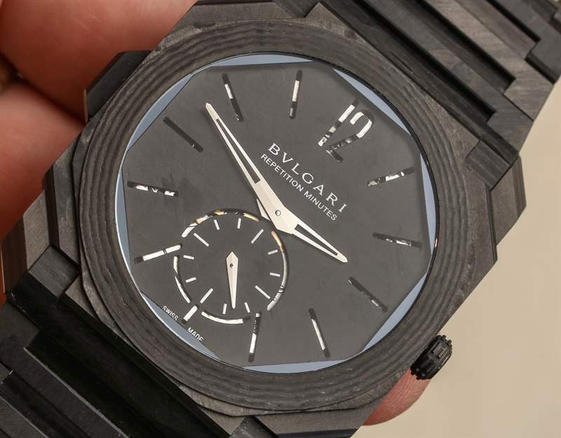 作為報時音樂手表,更有趣的是碳 CTP 材料如何影響三問復雜功能的聲音。如果您從我們關于 Octo Finissimo Minute Repeater 的原始文章中回想一下,為了確保在如此薄的表殼中保持良好的音量,Octo Finissimo Minute Repeater 的表盤上有穿孔的時標(寶格麗稱它們為“鰓”),可以讓空氣流通,因此在表盤和移動區域之間移動的聲音