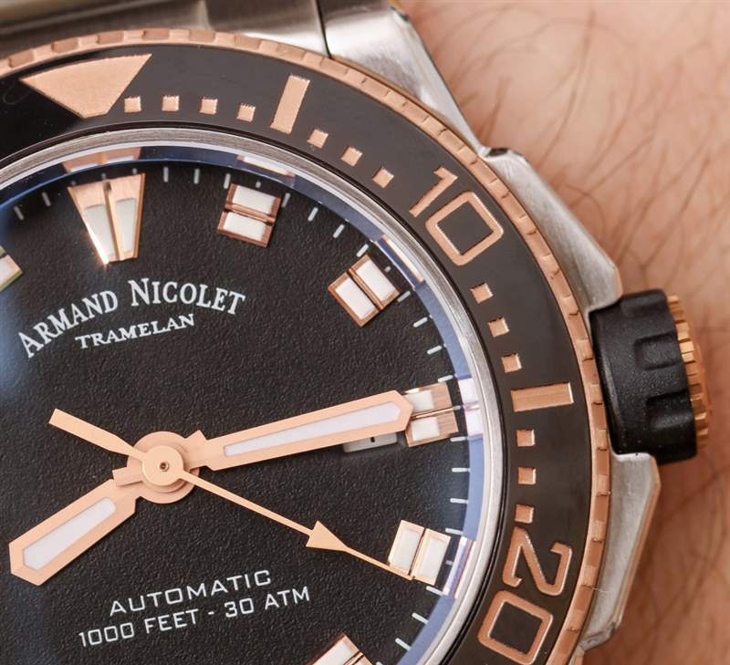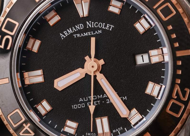 表盤周圍是我上面提到的傾斜旋轉潛水表圈。表圈嵌件材料采用拋光黑色陶瓷,表圈上的機切數字根據JS9的版本涂有不同的顏色。除了這種玫瑰金色油漆外,其他版本還使用了白色/銀色。JS9 的表盤顏色目前為白色、黑色和藍色。Armand Nicolet 似乎真的很喜歡玫瑰金外觀,因為 2018 年可用的 JS9 型號中有一半以上采用這種顏色。一些最有趣的與審查版本相似,但帶有白色表盤。“經典” JS9 潛水表型號可能是帶有銀色/白色文字/標記和藍色或黑色表盤的型號。