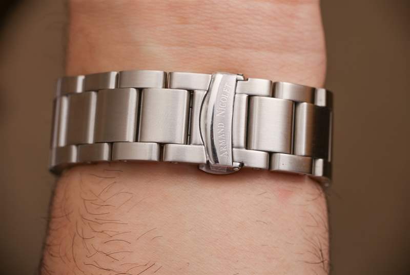 手表愛好者會注意到表耳設計令人想起愛彼皇家橡樹或宇舶 Big Bang。這種設計使表鏈和表耳的末端在視覺上融合在一起,形成了一個堅固的結構。現在,橡膠表帶不像漂亮的金屬手鏈那樣“花哨”,但它們對于實際運動目的更有意義。Armand Nicolet 要求您在手鏈或橡膠表帶之間進行選擇,而無需同時提供它們。我本來希望手鐲上的 JS9 手表版本還包括一條橡膠表帶。我很確定消費者愿意為此支付適度的溢價。