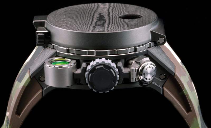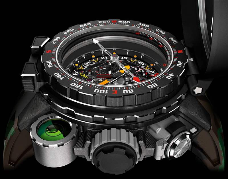 現(xiàn)在是生存主義者的東西。請記住,這款手表是為約翰·蘭博設計的,可用于攜帶他的求生刀。據(jù)我所知,Richard Mille 第一次在手表中加入了一個模擬指南針,而對于 RM 25-01,它是可拆卸的。這款手表有兩個表圈選項,其中一個在表盤上有一個折疊鈦和碳 TPT 罩。這是羅盤表圈,它包括一個位于表盤正上方的磁性羅盤指針。