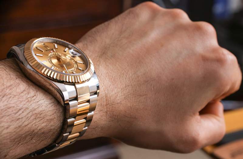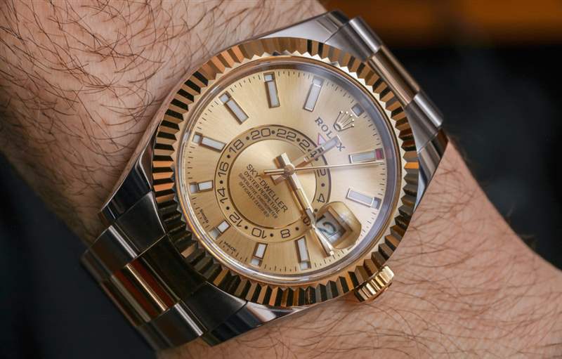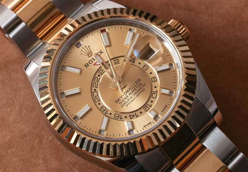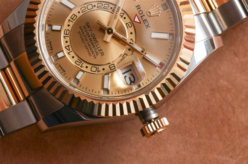 Sky-Dweller 與大多數其他勞力士手表的區別還在于尺寸。盡管表殼設計仍然是我們所熟知和喜愛的勞力士蠔式,但勞力士將其制作成 42 毫米寬的表殼,使其成為該品牌生產的最大的“考究”時計。在發布時也可以預見的是,Sky-Dweller 會非常昂貴。勞力士傾向于在全金表殼中推出新型號和機芯,后來才推出雙色或全鋼表款。因此,勞力士直到 2017 年才推出 Rolesor(鋼和金)版本的 Sky-Dweller。沒有全鋼型號,因為勞力士標志性的凹槽表圈是用金制成的。然而,最“易于使用”的 Sky-Dweller 版本配備全鋼表鏈和表殼,表圈僅采用 18k 白金制成??陀^地說,搭配手鐲的 18k 永恒玫瑰金 Sky-Dweller 目前售價 48,850 美元,而主要為鋼制型號的入門級價格為 14,400 美元。評測參考 326933 的價格為 17,150 美元,因為表鏈和表冠中添加了黃金材料。
