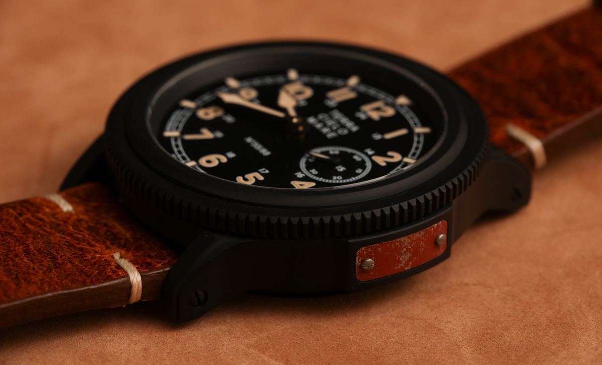 機箱右側是一塊金屬牌匾,上面涂有腐爛的紅色油漆。這就是名稱中“零森”部分的來源。這塊金屬取自二戰日本三菱 A6M 戰斗機——顯然是日本人在太平洋戰區遺棄的那架. A6M 也被稱為“零”,仍然是那個時代最知名的日本汽車。我相信這塊特殊的金屬是從飛機上畫的一個紅色圓圈中切割下來的,它旨在喚起日本國旗并指定飛行該飛機的國家。作為軍事史迷,我發現這種與二戰的聯系很有趣,盡管我確實覺得將手表與武器聯系起來有時是一件令人毛骨悚然的事情。無論如何,即使牌匾很酷,
